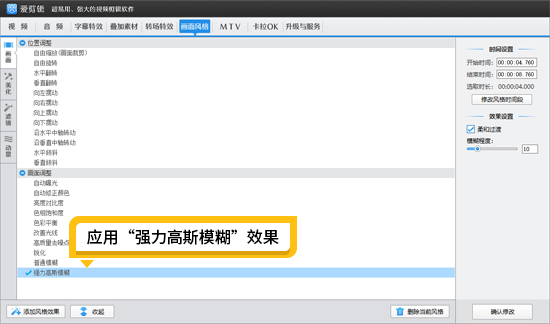 导入正片视频,截取4秒。接着对这个片段应用“画面风格”栏目的“强力高斯模糊”。勾选“柔和过渡”,模糊程度为10。这样可以让接下来的图片展示更加突出。