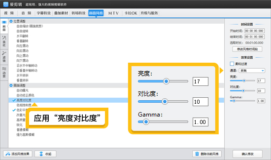 此外,部分偏黄视频还存在光线不足的情况。这里可以启用爱剪辑的“亮度对比度”功能,将亮度滑块拖至17,其他参数维持原样,画面就会变得清晰明亮起来。